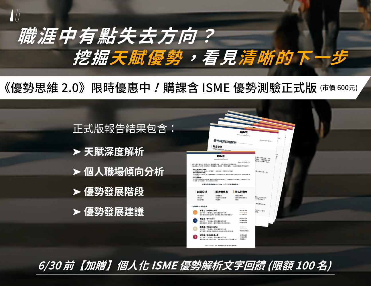 《優勢思維 2.0》課程包含豐富的學習單和職場應用案例,讓你的探索更有依據和效率。獨家設計的 ISME 職場優勢測驗,會帶你看見隱藏的優勢和動力,具體了解如何在職場中發揮個人。