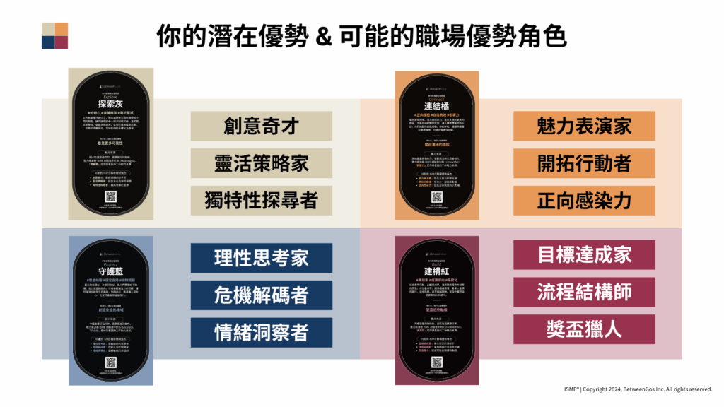基於這四大動力,ISME 測驗進一步分析你的思考模式和行為傾向,最終形成 12 種不同的職場優勢角色。每個人會得到其中 3 個角色作為結果,幫助大家更能直接想像「如果我是這個角色,我可以怎麼在工作中發揮價值」。